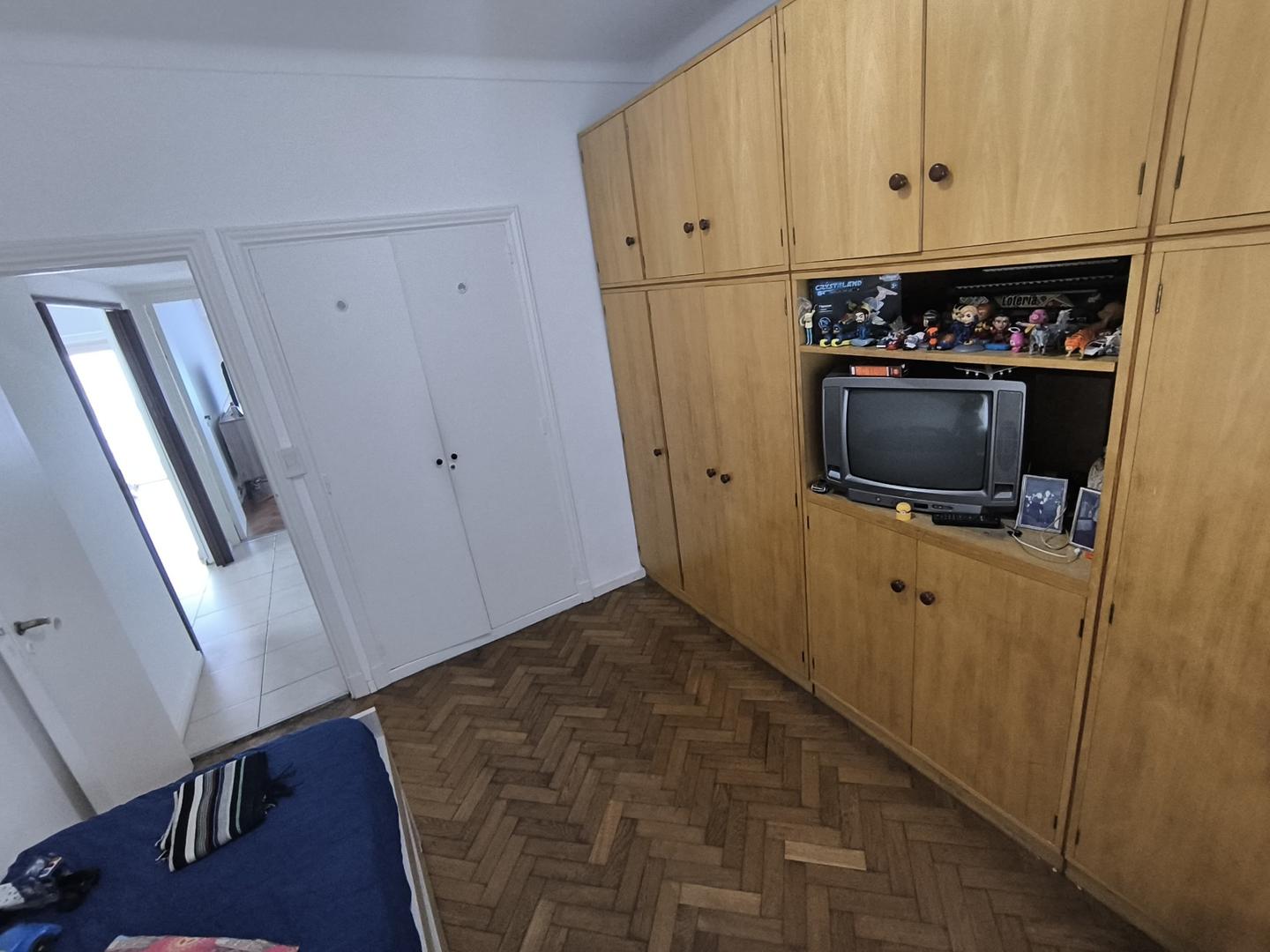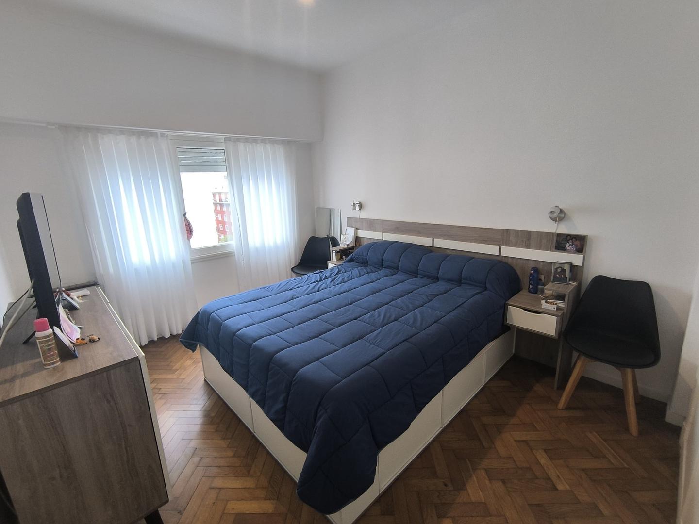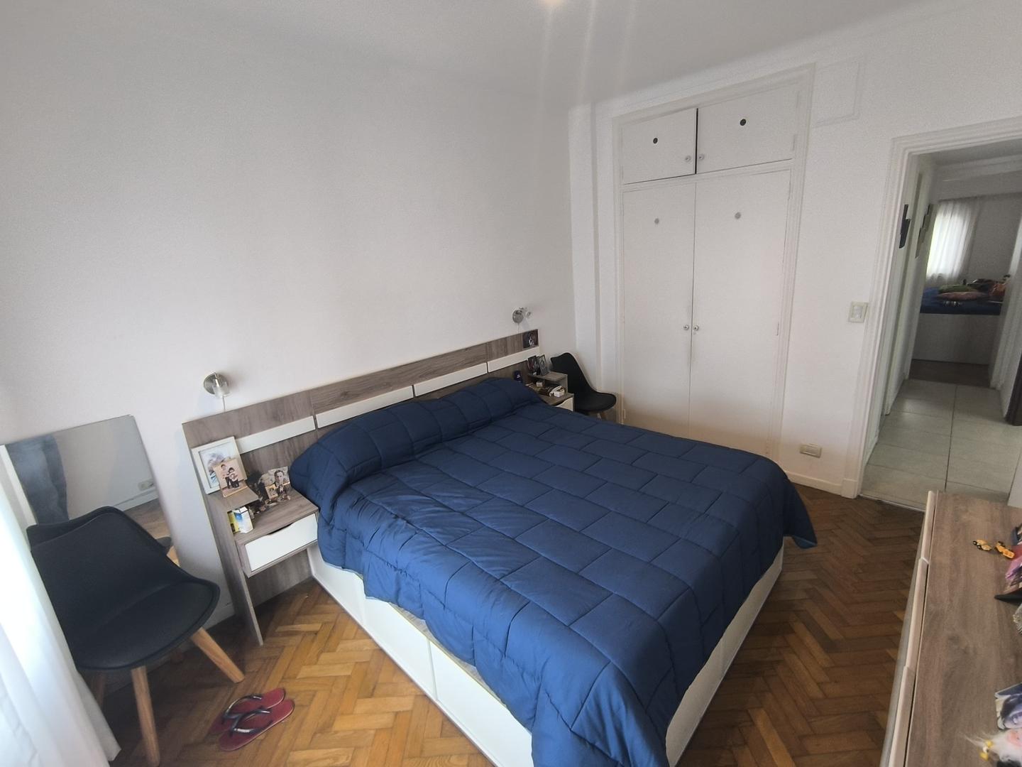 Dispone de dos habitaciones con pisos de parqué y placares empotrados, la principal es de generosas dimensiones, al frente y con calefactor.
